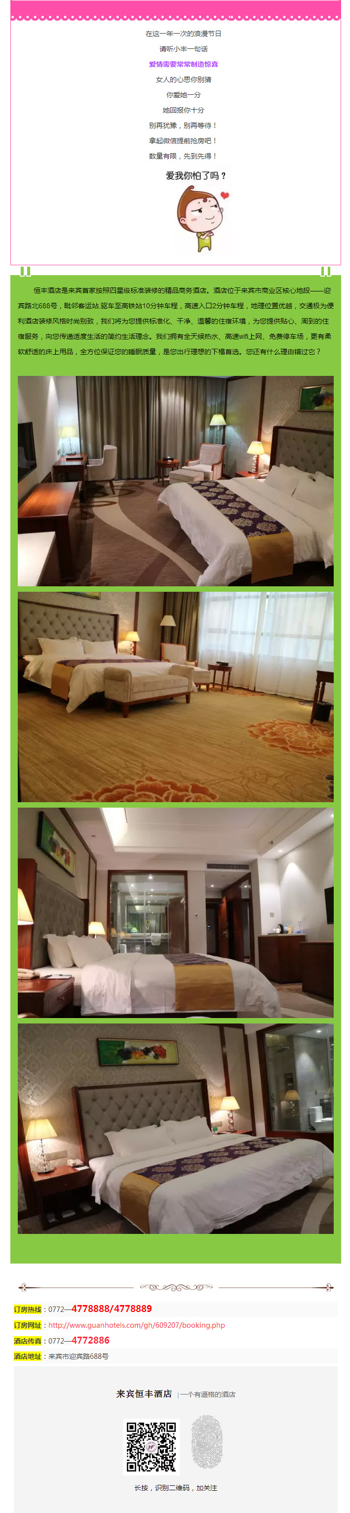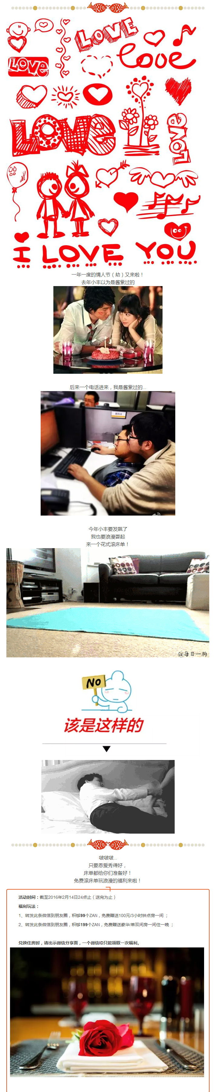 只要恩愛秀得好,床單為你準備好,情人節(jié)分享微信就能到恒豐酒店免費開房!